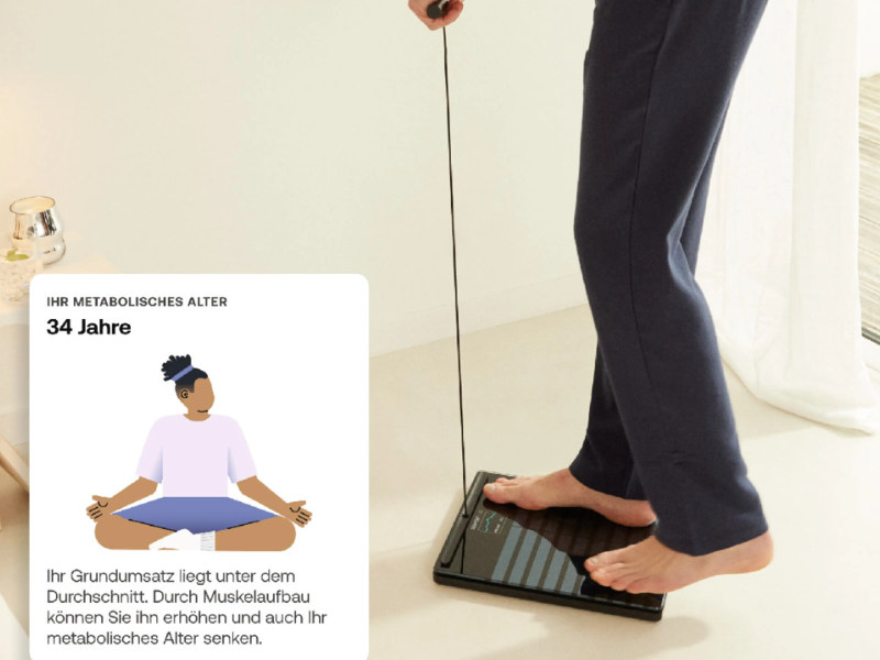 Die Waage berechnet Dein metabolisches Alter und Deinen täglichen Kalorienbedarf. Diese Informationen helfen Dir, realistische Ernährungs- und Bewegungsziele zu setzen. In der Withings Health Mate App kannst Du Deine Ernährung tracken und erhältst personalisierte Empfehlungen.